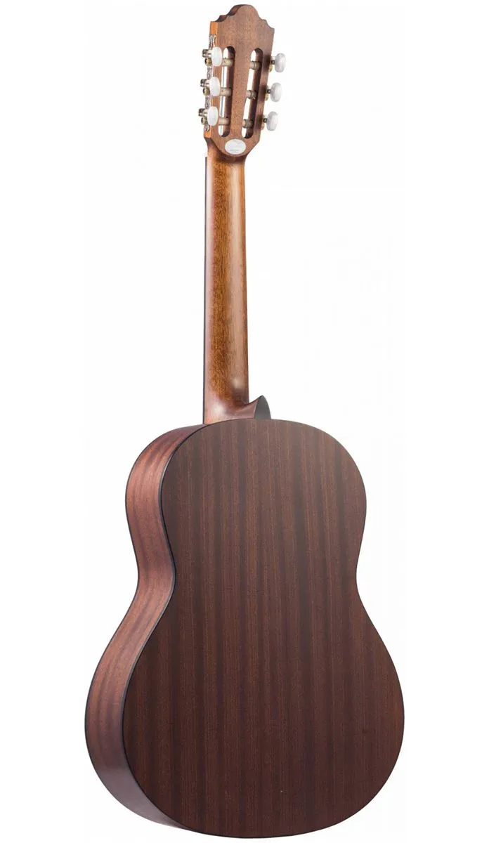 Линейка 100 выполнена из ели Энгельмана, что обеспечивает большую чувствительность и отзывчивость. Звучание громкое, звонкое, прекрасно сбалансированное по всем частотам. Гриф и корпус выполнены из красного дерева, он достаточно широкий, характерной для классических гитар удобной формы. Накладка - палисандр. Мензура – 650 мм, лады – без инкрустации.